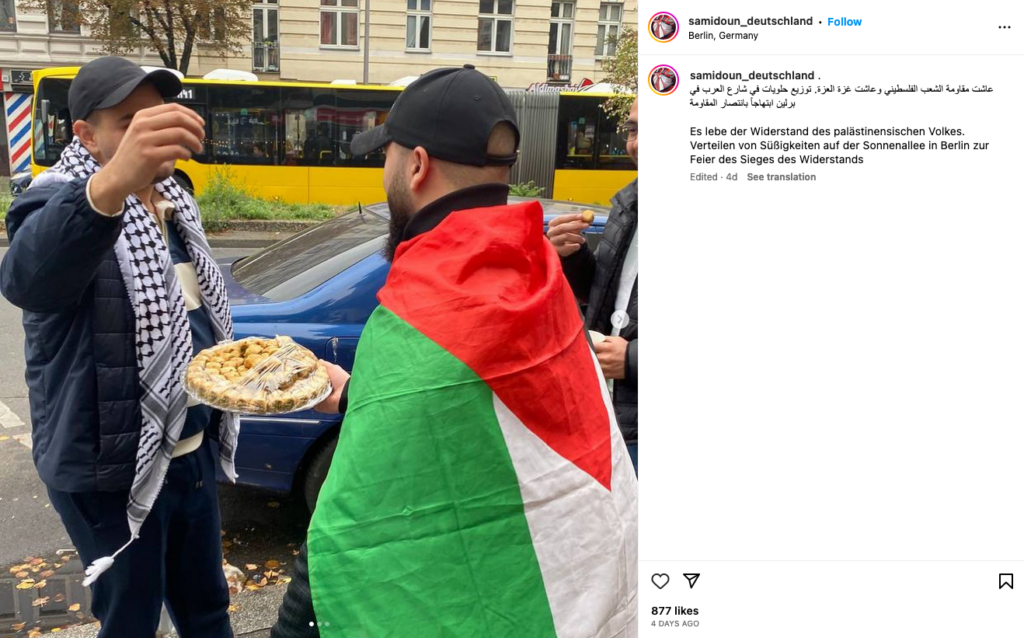 Denn für Samidoun ist der Terror Grund zum Feiern: „Es lebe der Widerstand des palästinensischen Volkes“, schreibt die Gruppierung auf Instagram unter einem Bild der Aktion. Die Süßigkeiten verteilen sie „zur Feier des Sieges des Widerstands“, wie im Gazastreifen und der Westbank üblich nach Terroranschlägen gegen Israel. Sie zelebrieren damit den Tod unschuldiger Menschen – Babys, Festivalbesucherinnen, Senioren.