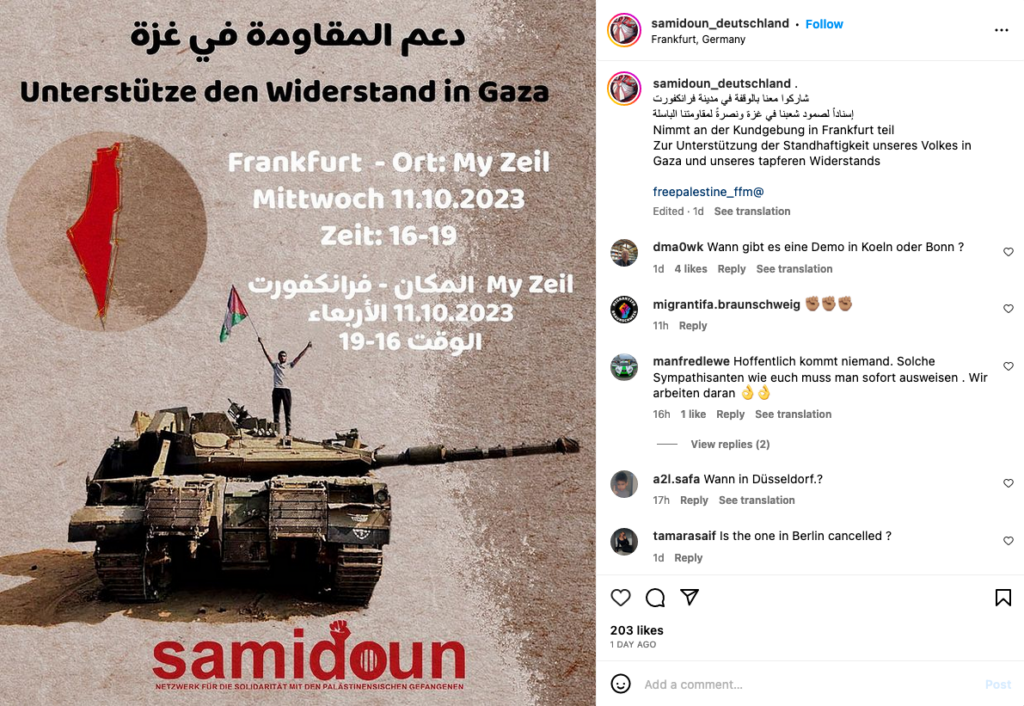 Auch auf Social Media ist Samidoun aktiv. Vor allem auf Instagram mit knapp 13.000 Followern (der deutsche Ableger hat 4.500). Durch Sharepics und Storys mobilisieren sie Menschen von Neukölln bis Vancouver, vereint im Israelhass. In einem Facebook-Beitrag aus November 2020 schreibt der deutsche Ableger: „Welche Sprache verstehen die zionistischen Verbrecher, außer der Sprache des bewaffneten Kampfes?“