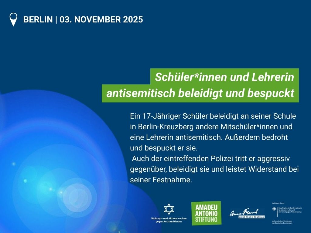 Unsere Chronik antisemitischer Vorfälle erfasst seit 2002 kontinuierlich antisemitische Vorfälle. Die Chronik wird auf Basis von Pressemeldungen sowie Informationen von Projekten, Initiativen und Privatpersonen fortlaufend erstellt und aktualisiert. Ziel ist es, die Alltäglichkeit vielfältiger Formen des Antisemitismus in Deutschland sichtbar zu machen – seien es nun tätliche Übergriffe, Beleidigungen, Vandalismus oder Shoah-Relativierung bzw. Leugnung. Dabei erhebt die Chronik keinen Anspruch auf Vollständigkeit.