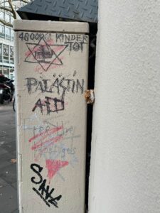 Unbekannte schmieren an einen Stromkasten „48000 KINDER TOT“ sowie einen Davidstern mit einem Hakenkreuz in der Mitte. Darunter steht „PALÄSTIN“. „Free the Hostages“ wird durchgestrichen und ein rotes auf der Spitze stehendes Dreieck darunter gemalt.