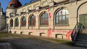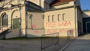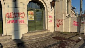 In der Nacht bevor im Felsenkeller eine Lesung des Buchs „Überlebenskampf. Kriegstagebuch aus Nahost“ von Arye Sharuz Shalicar (Sprecher der IDF) im Gespräch mit Linda Teuteberg (Rechtsanwältin und Politikerin) und Ahmad Mansour (israelisch-deutscher Psychologe und Autor arabisch-palästinensischer Herkunft) stattfindet, wird die Außenfassade der Veranstaltungsstätte mit folgenden Parolen beschmiert:
