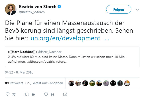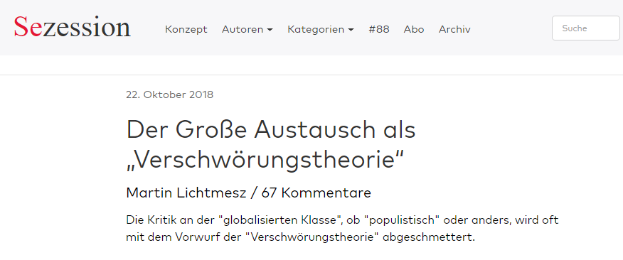 The replacement narrative has become a central ideological element of the so-called “New” Right. Right-wing populists such as Beatrix von Storch, Deputy Leader of the Alternative for Germany party, make references to it and “New” Right magazines such as the German “Sezession” (“Secession”) by publisher Götz Kubitschek are defending the concept.