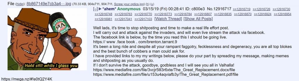 At the same time, the manifesto and the video of the crime contain allusions to the 8chan environment or the US alt-right movement. For instance, at the beginning of the video, “Tarrant” invokes a meme that asks people to subscribe to a YouTuber popular in the scene. During the ride to the crime scene, the song “Remove Kebab” is playing in the background, a song which was originally used by Serbian soldiers as a tribute to a war criminal and that has since turned into an anti-Muslim 8chan meme.