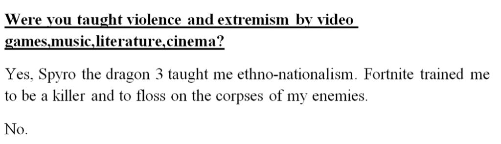 Evans identifies so-called “shitposting” in large parts of the manifesto, in other words various kinds of partly ironic and eye-catching content which is meant to provoke the reader or to mislead them. For example, there is an “interview section” in which the author is asked whether video games made them violent.