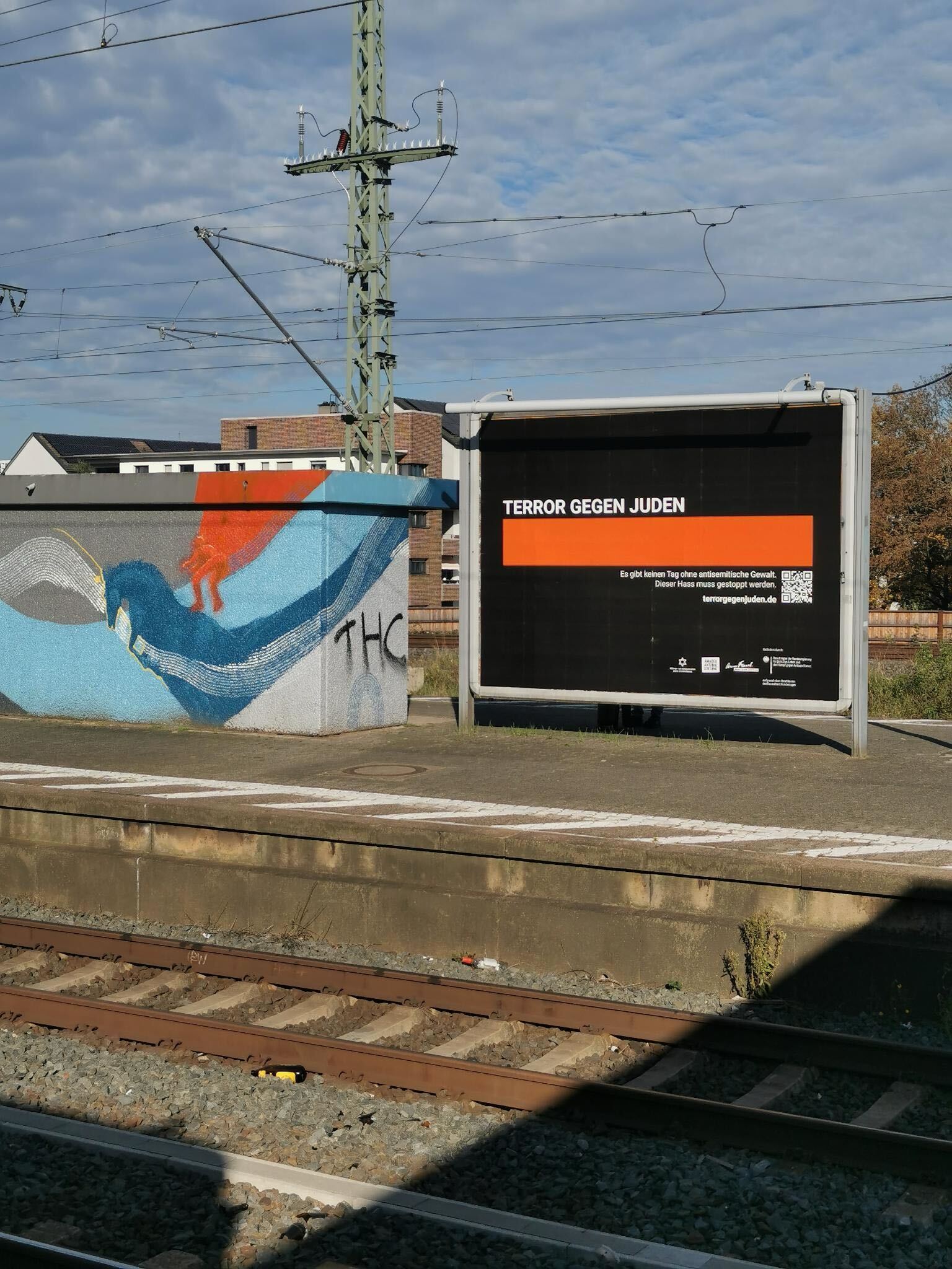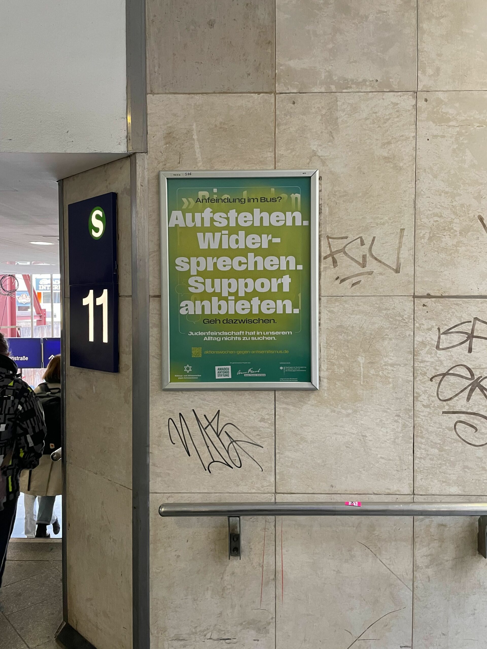 Aber das ist noch nicht alles. Jedes Jahr intervenieren wir auch mit einer bundesweiten Kampagne gegen Antisemitismus: 2024 konnte man unsere Plakate in über 80 Städten finden und in dutzenden Kinos bundesweit unseren Trailer sehen. 2025 findet ihr die Plakate an über 1.200 Standorten in ganz Deutschland!