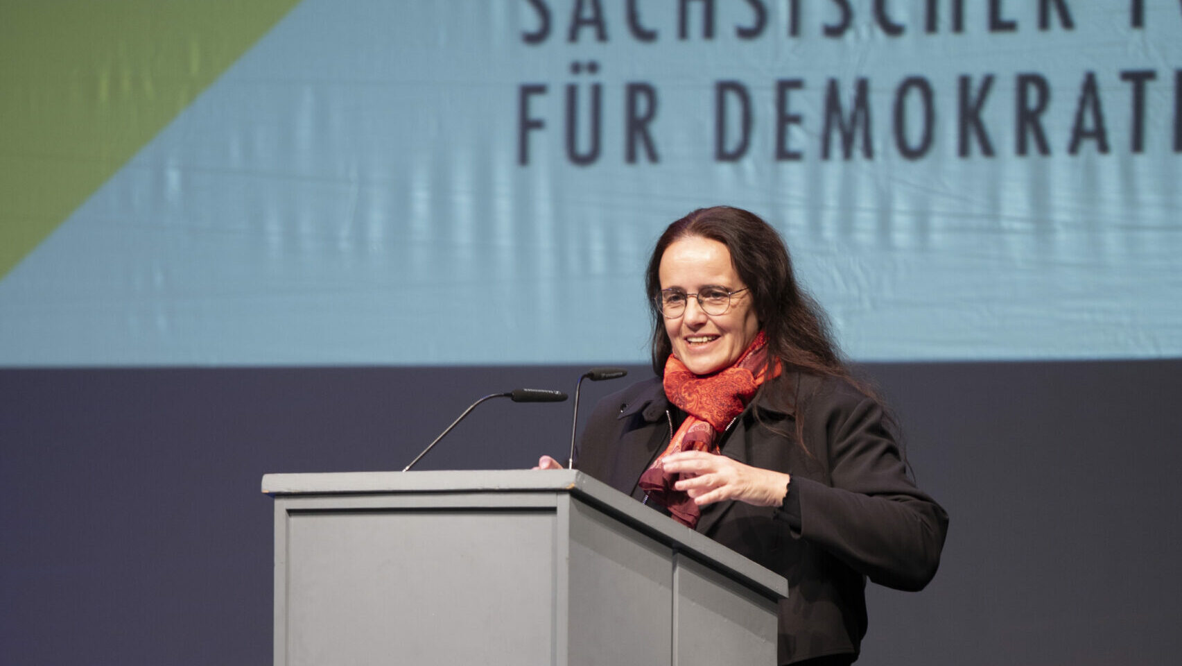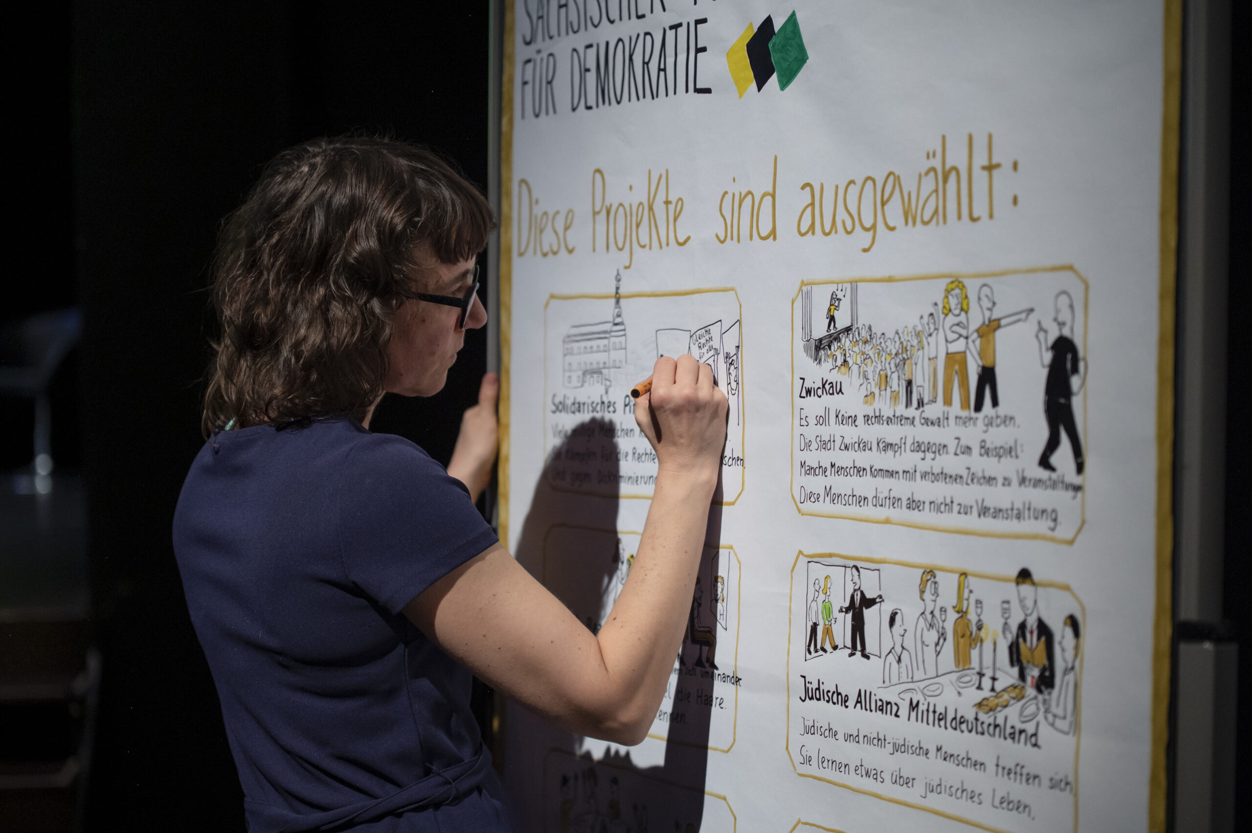 Am 6. November 2025 wurde der Sächsische Förderpreis für Demokratie im Kleinen Haus des Staatsschauspiels Dresden feierlich verliehen. In drei Kategorien wurden insgesamt acht Preisträger*innen für ihr herausragendes Engagement ausgezeichnet. Grußworte von Joachim Klement, Timo Reinfrank und Staatssekretärin Dagmar Neukirch sowie die Festrede von Dr. Matthias Quent verliehen dem Abend inhaltliche Tiefe. Musikalisch begleitet wurde die Veranstaltung von Friedrich Greiling, während Tanja Krone mit einer lebendigen, pointierten Moderation durch das Programm führte. Erstmals wurde die Preisverleihung zudem durch ein Graphic Recording in Leichter Sprache von Simone Fass begleitet, das Inhalte visuell zugänglich machte und neue Zugänge eröffnete.