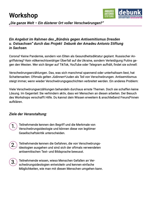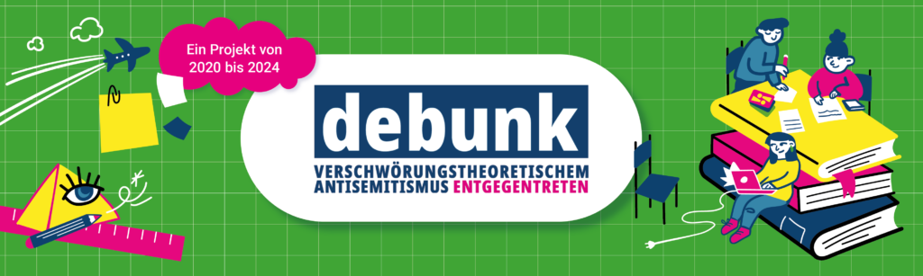 … Verschwörungsideologien stellen komplexe gesellschaftliche Ereignisse oder Prozesse als Teil einer „jüdischen Weltverschwörung“ dar und bieten autoritäre Lösungsvorschläge an, die sich gegen Minderheiten und die Grundwerte einer freien und offenen Gesellschaft richten. Gerade für Jugendliche und junge Erwachsene sind sie attraktiv: Als Gesellschaftskritik getarnt, werden Antisemitismus und Verschwörungsideologien zum vermeintlichen Ausdruck der Auflehnung gegen reale oder erdachte Autoritäten. Antisemitische Codes, wie beispielsweise das Bild einer geheimen Macht im Hintergrund, zu nutzen und sich als „gute*r Widerstandskämpfer*in“ zu inszenieren, wirkt für junge Leute in der Suche nach Identifikation anziehend. Beides verschleiert den zugrundeliegenden Antisemitismus und ein „sanfter“ Weg zur Radikalisierung kann geebnet sein. Debunk hat sich zum Ziel gemacht Verschwörungsideologien ihre Anziehungskraft für Jugendliche und junge Erwachsene zu nehmen. Während der Projektlaufzeit 2020 bis 2024 wurden konkrete Bildungsangebote in Form multimedialer Produkte erstellt. In Projekttagen und Workshops wurden Jugendliche, junge Erwachsene und Lehrkräfte