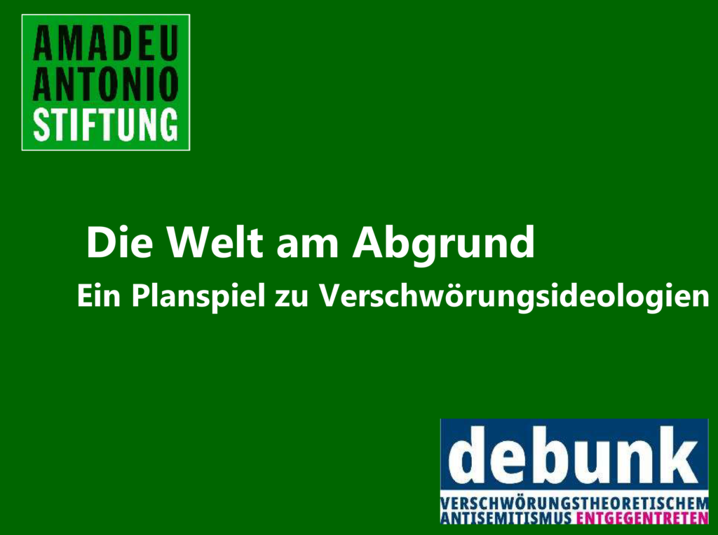 Die Erdlochkatastrophe bedroht Menschenleben. Im Rahmen eines Sondergipfels kommen Politiker*innen und Unternehmer*innen zusammen und müssen Lösungsansätze für die globale Katastrophe entwickeln. Im Spiel gibt es fünf verschiedene Delegationen, die jeweils ganz eigene Erklärungsansätze, sowie Forderungen an die Situation stellen. Dabei vertreten einige der Delegtationen verschwörungsideologische Argumentationen, andere nicht. Jede Schüler*in übernimmt eine aktive Rolle im Spiel und gestaltet den Sondergipfel mit. Mit ihrer Rolle übernehmen sie auch die Einstellung und das Weltbild der jeweiligen Delegation, der sie angehören. Auf der Suche nach der Wahrheit und einer Lösung für die Katastrophe gilt es, ins Diskutieren und Argumentieren zu kommen. Ziel des Planspiels ist es, den Schüler*innen über das eigene Erleben einen interaktiven und reflexiven Zugang zu wesentlichen Merkmalen und Funktionsweisen von Verschwörungsideologien zu vermitteln. Gemeinsam wird erarbeitet, wo die Gefahren von Verschwörungsglaube liegen und welche Zusammenhänge zwischen Antisemitismus und Verschwörungsideologien bestehen. Durchgeführt werden kann das Planspiel von pädagogischen Fachkräften, sowie von erfahrenen Bildungsreferent*innen.